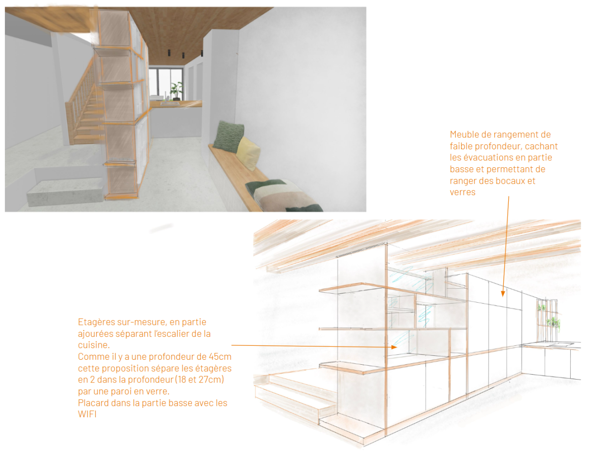 Réaménagement de l'entrée. Intégration de rangements peu profonds près de l'evier, idéal pour les bocaux et provisions, et rangement bibliothèque ouverts au niveau de l'escalier. Long banc avec rangements, liant l'entrée et la cuisine, pouvant aussi servir de coin lecture.